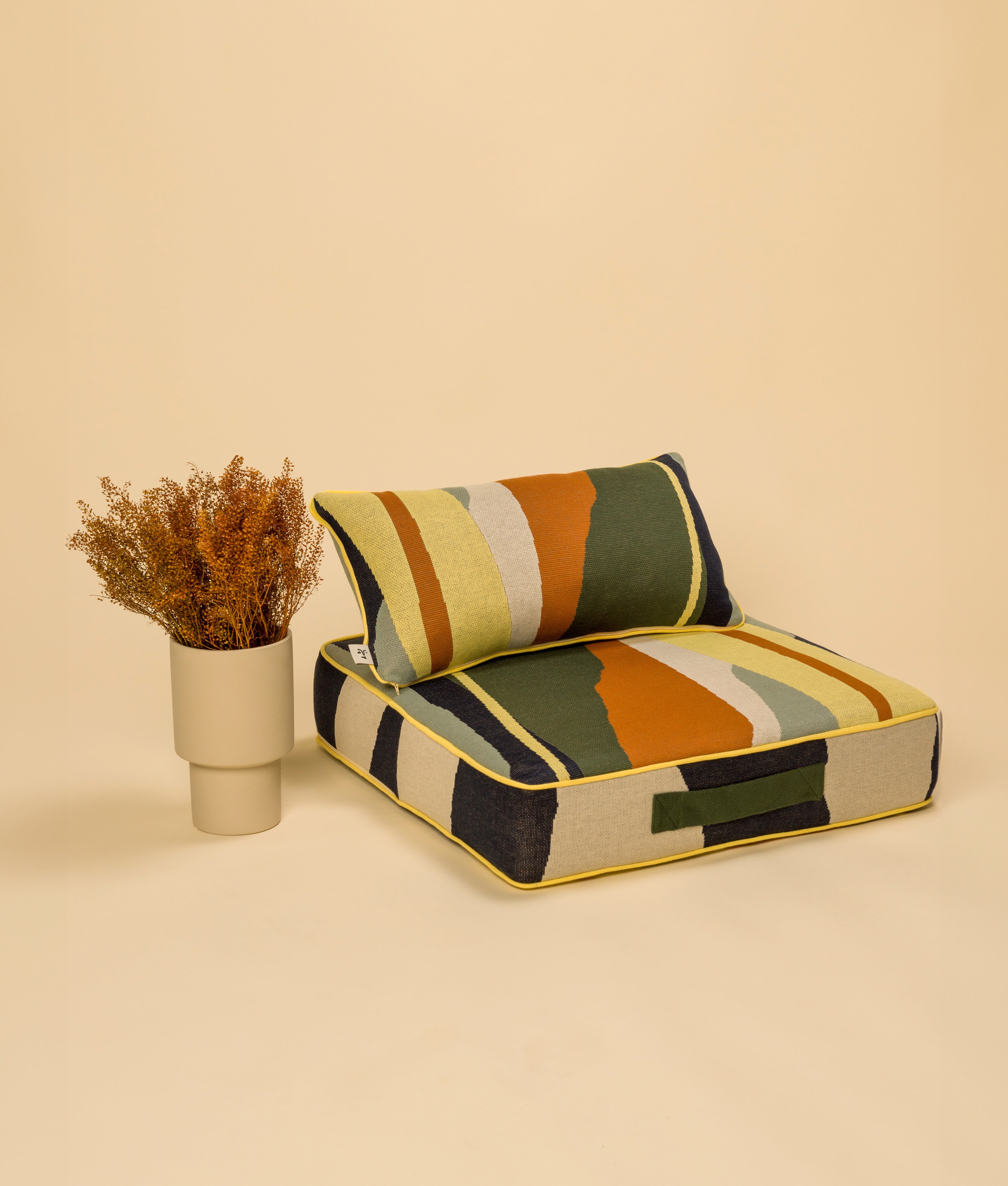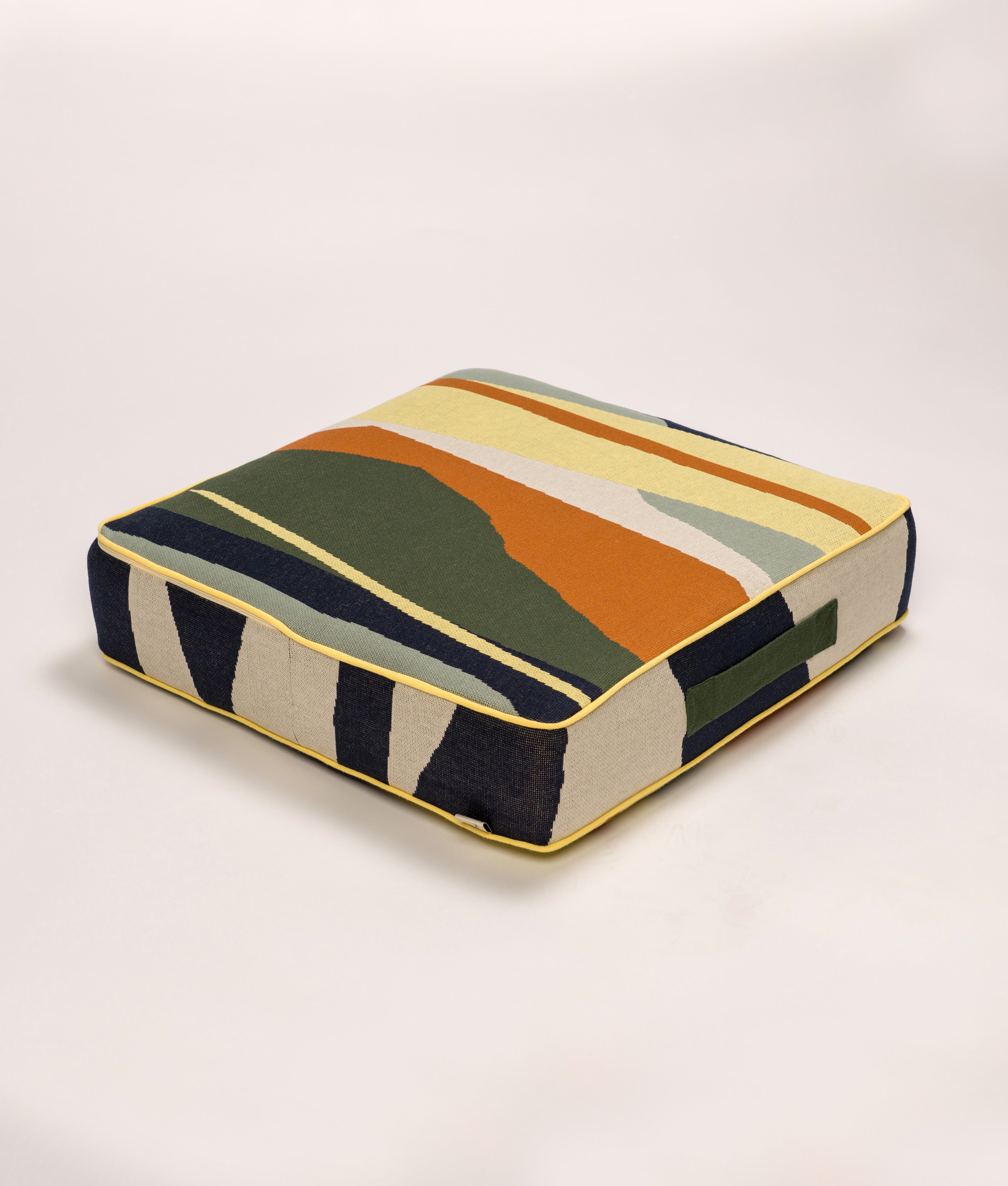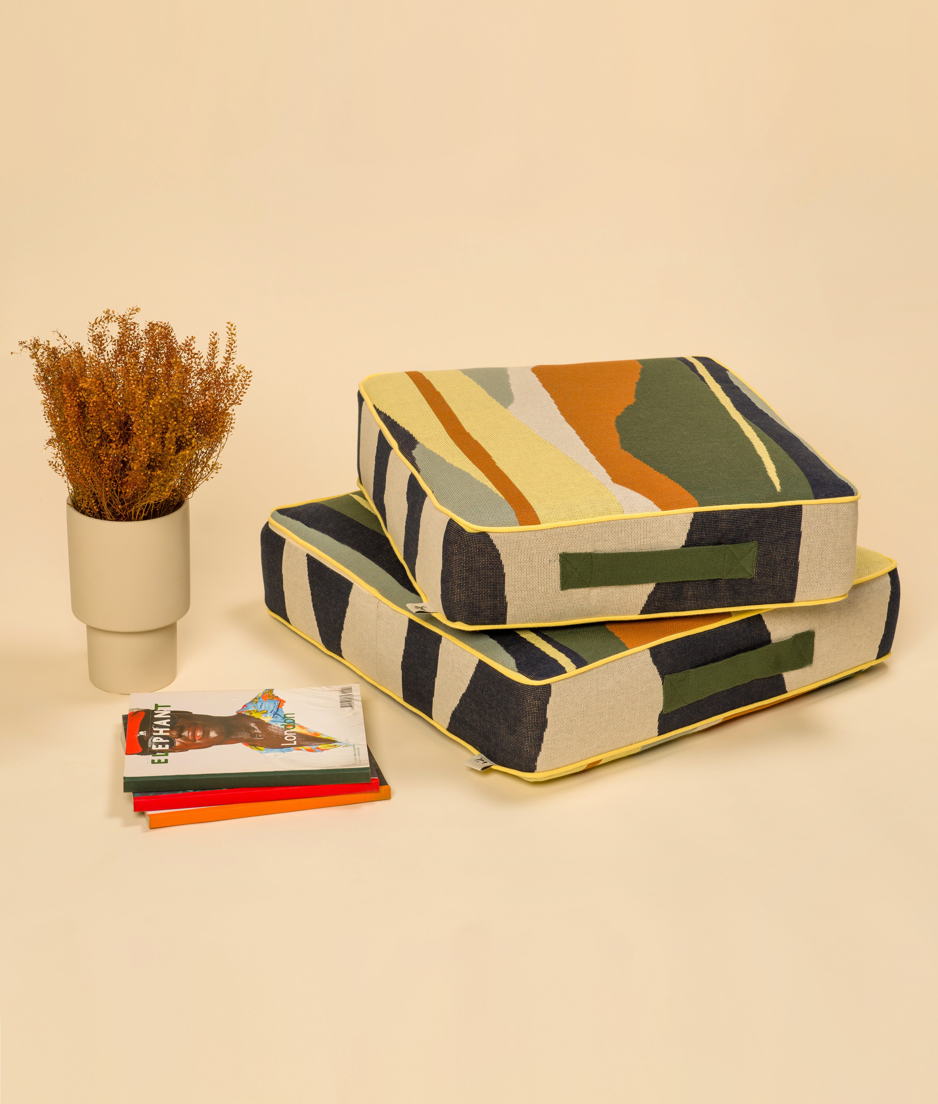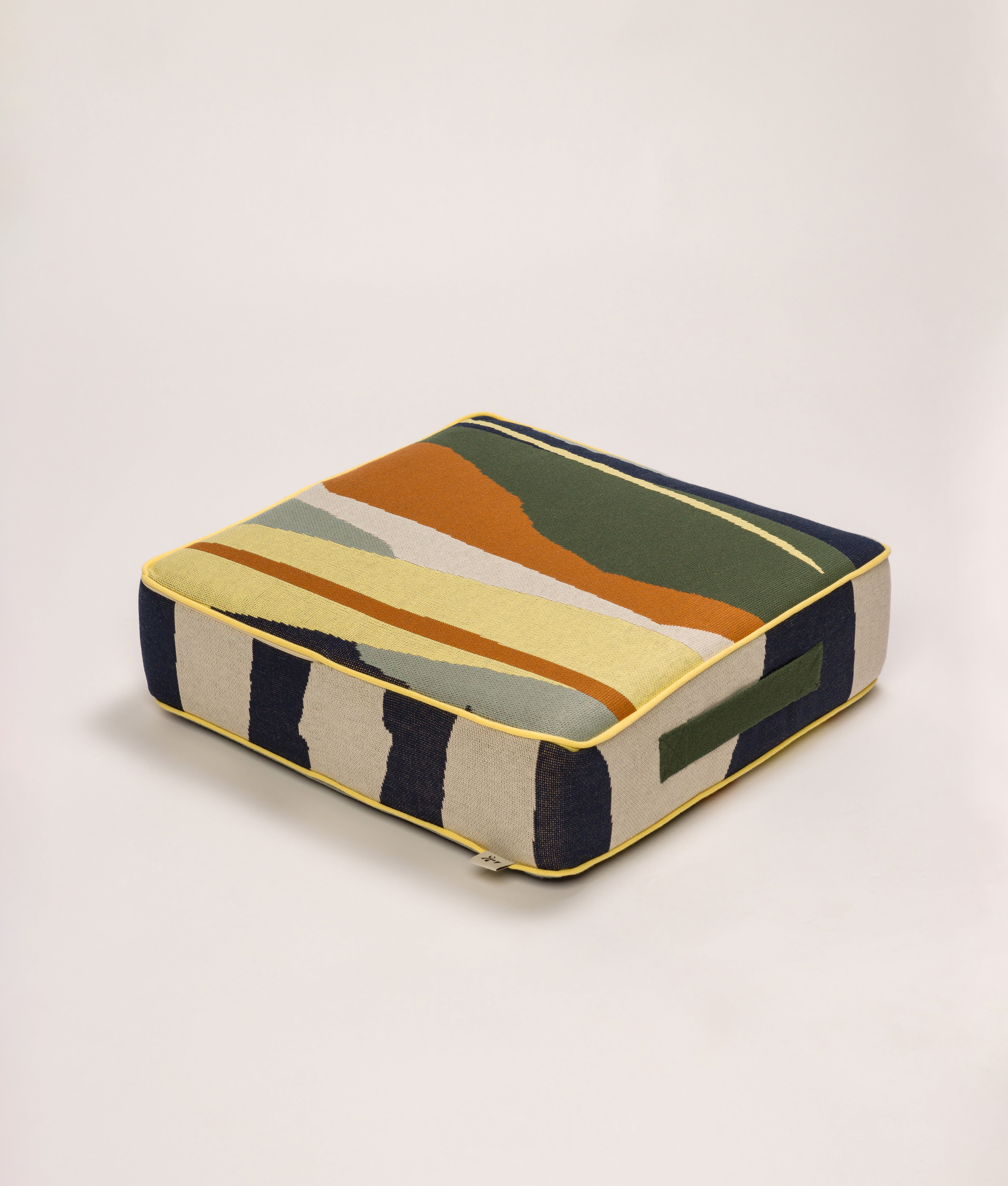Almofada tipo pufe com capa lavável feita em tricô com fio Seridó - à base de algodão - e recheio em espuma D28. A capa da almofada possui fechamento com zíper e alça para que você possa carregar com facilidade. O recheio é protegido por capa de malha costurada à mão.
