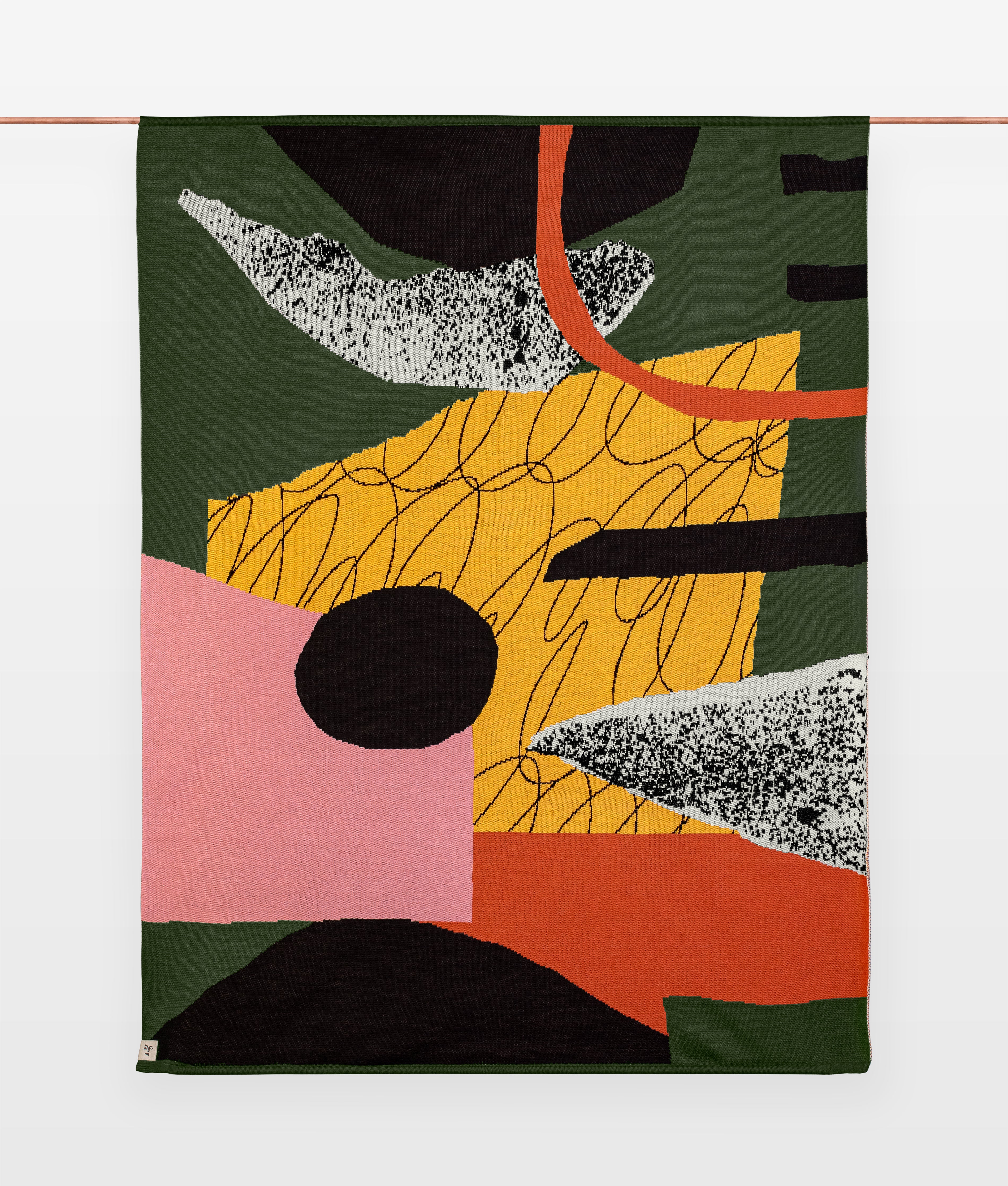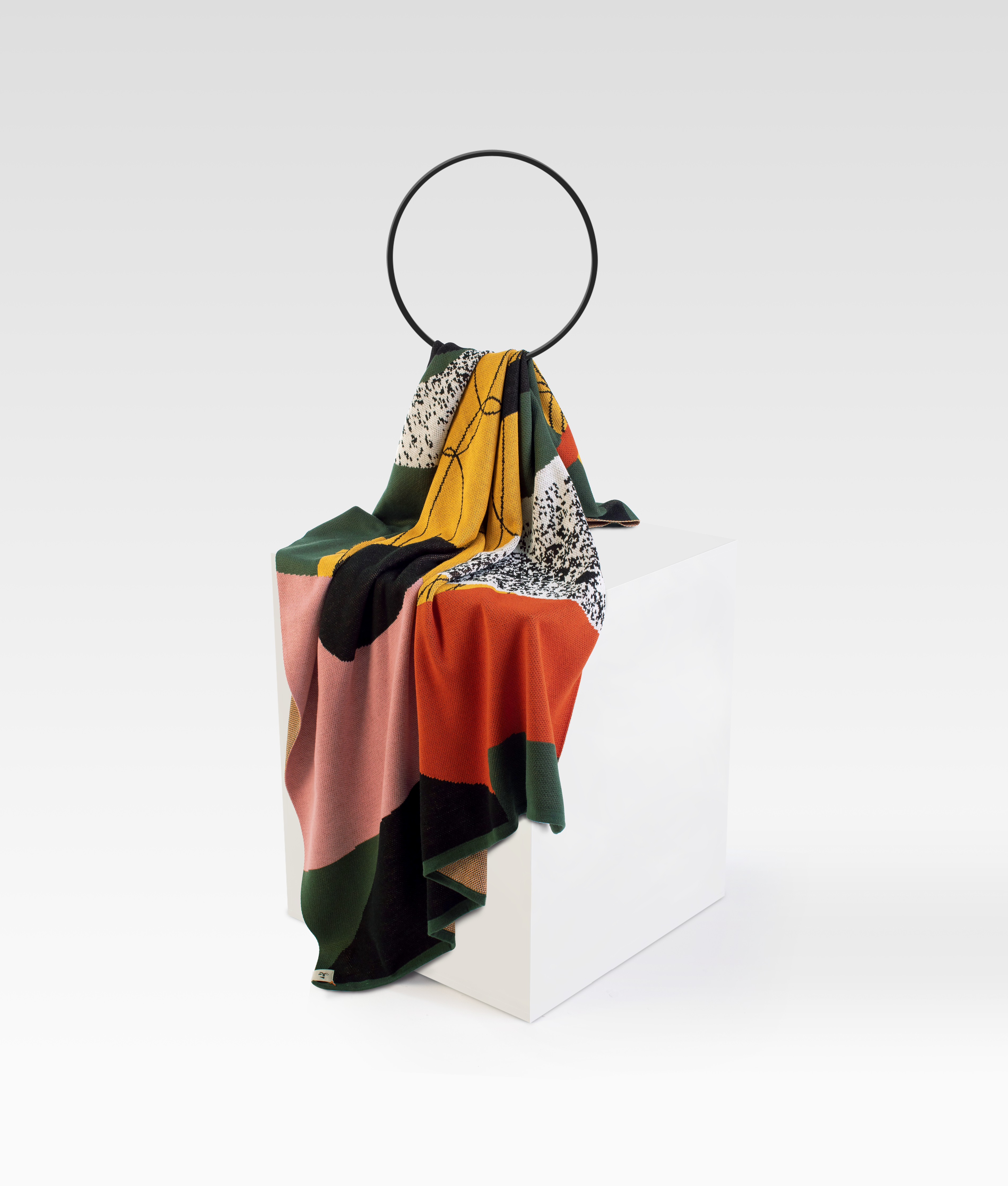 O desenho desta manta foi criado a partir de colagem feita à mão com papel e reproduzido em tricô com fio Seridó, à base de algodão.