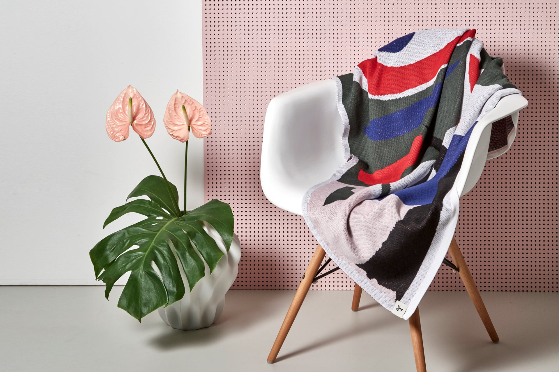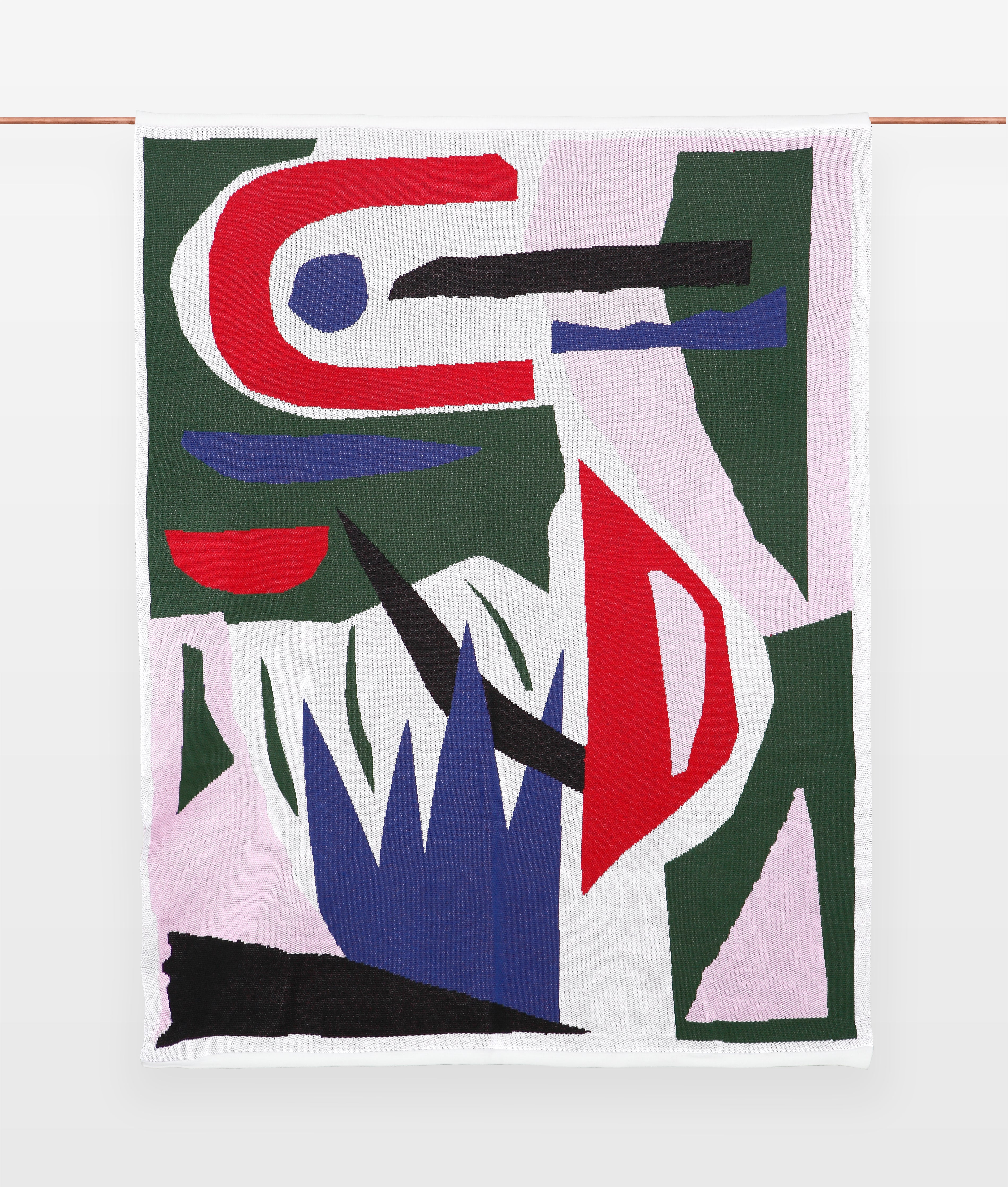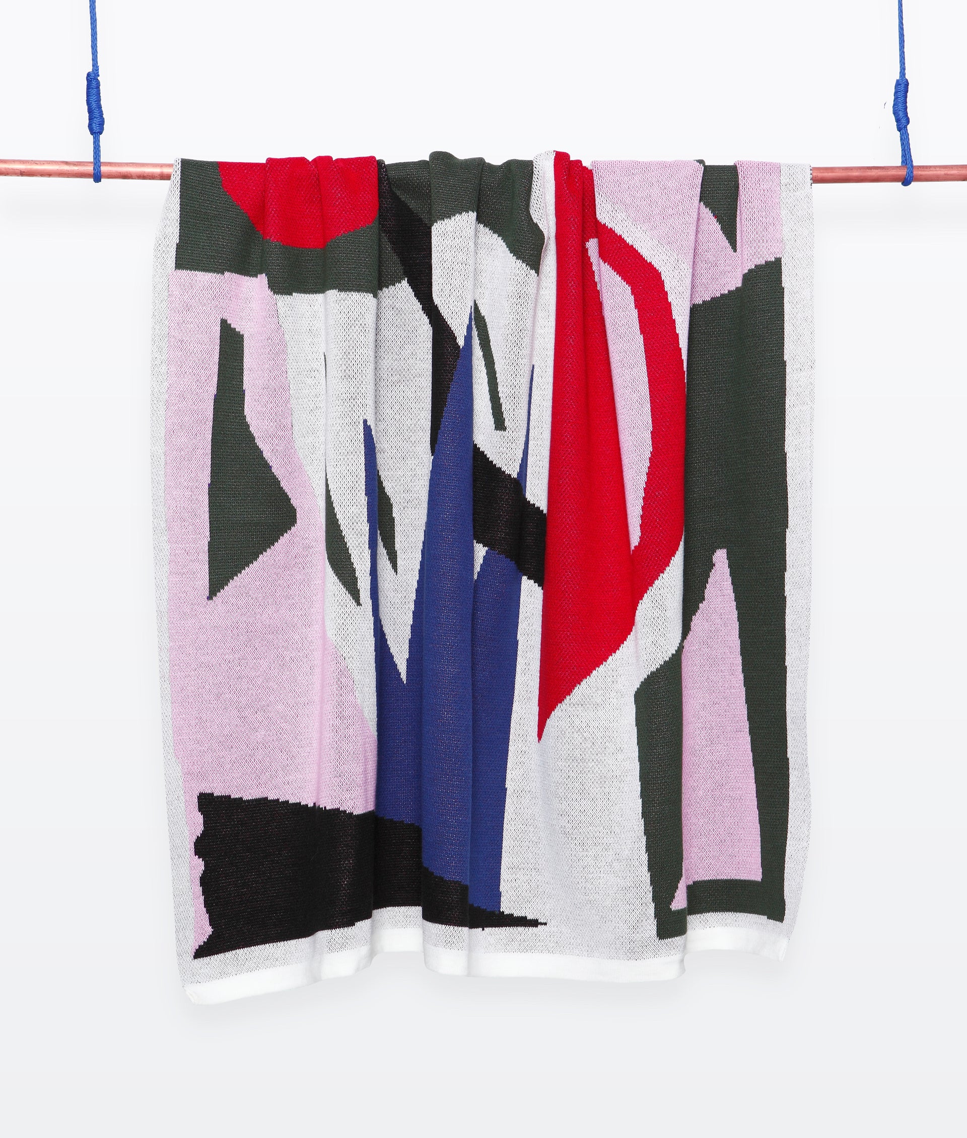 O desenho desta manta foi criado a partir de colagem feita à mão com papel e reproduzido em tricô com fio Seridó, à base de algodão.