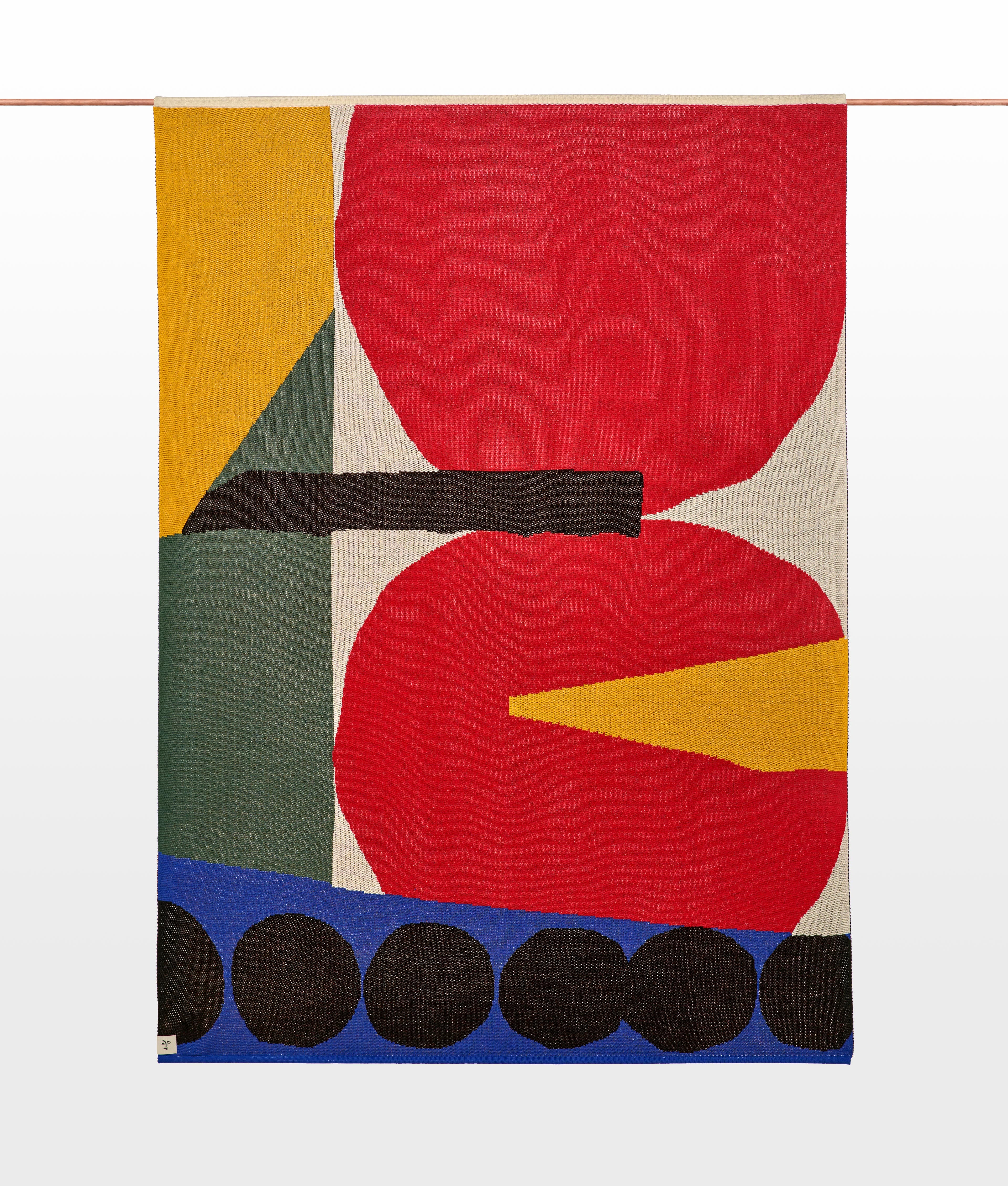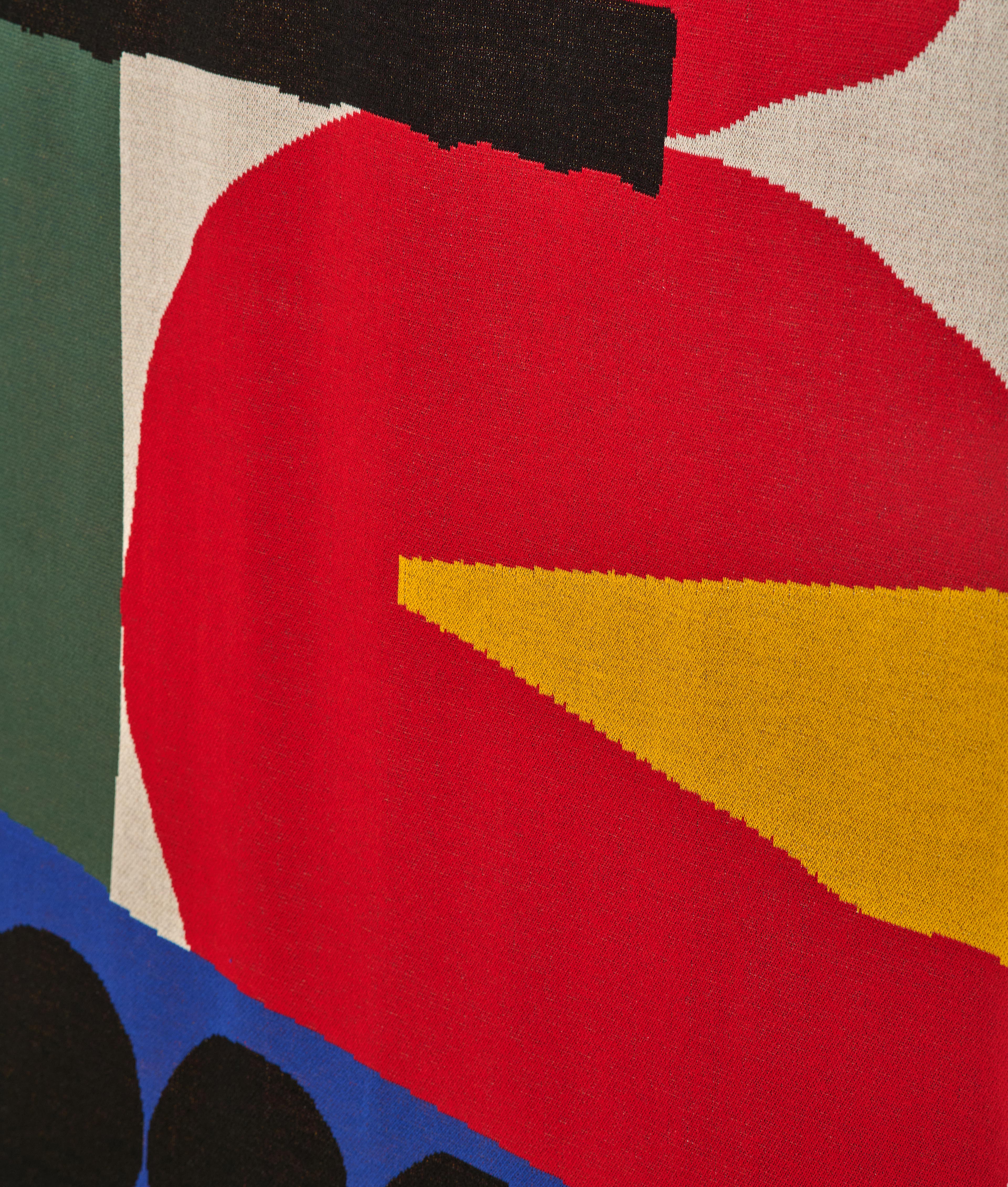 O desenho desta manta foi criado a partir de colagem feita à mão com papel e reproduzido em tricô com fio Seridó, à base de algodão.