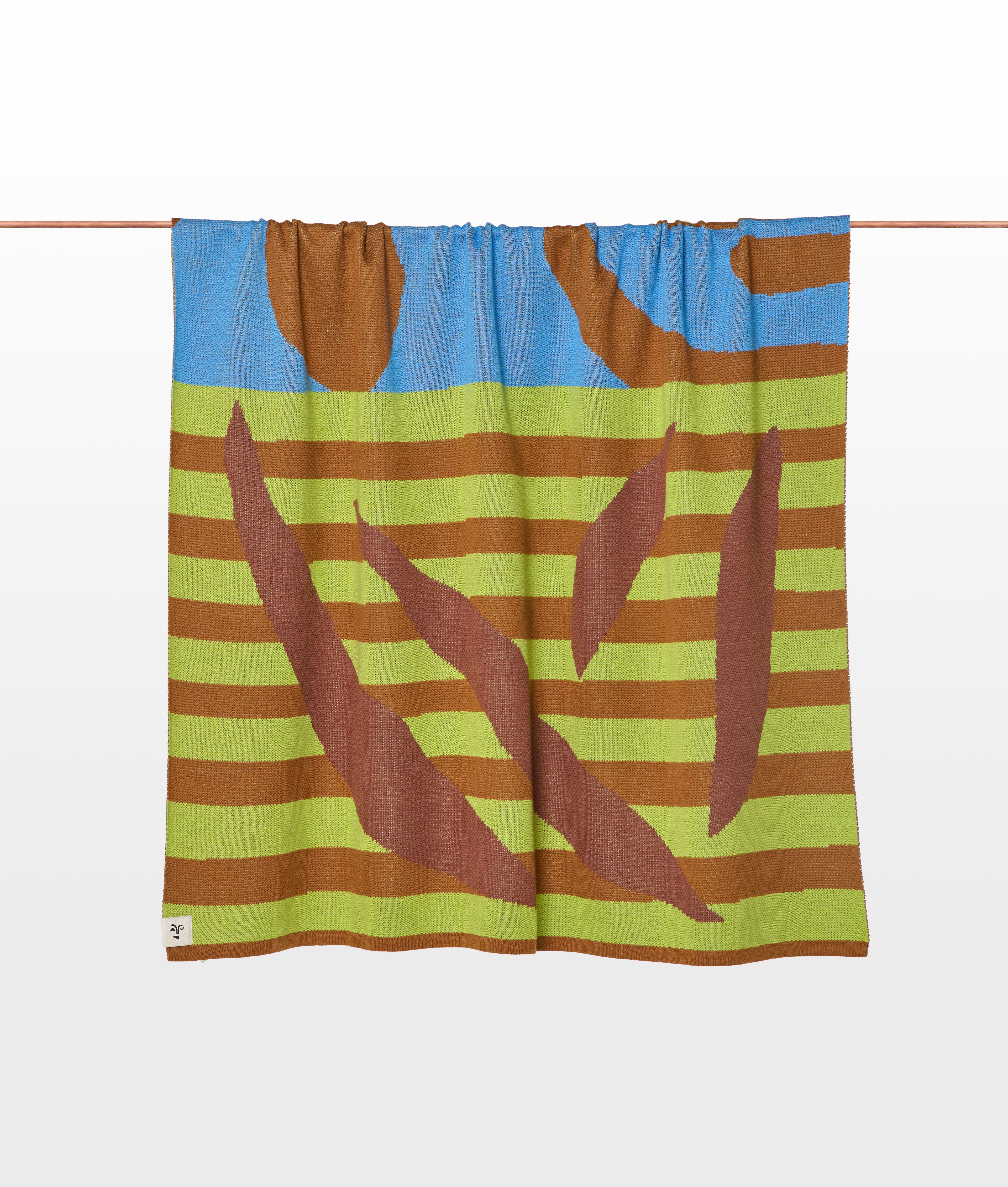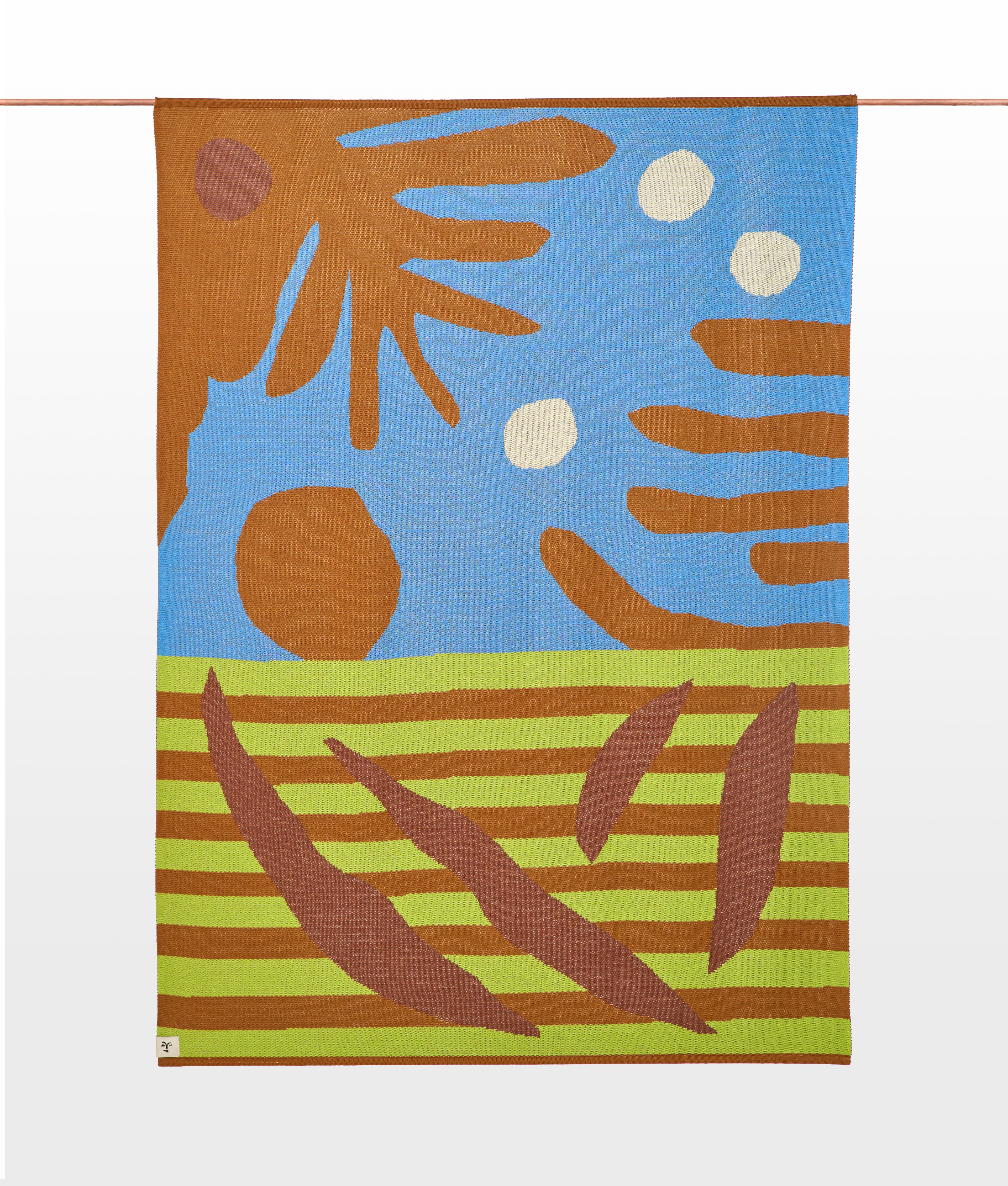 O desenho desta manta foi criado a partir de colagem feita à mão com papel e reproduzido em tricô com fio Seridó, à base de algodão.