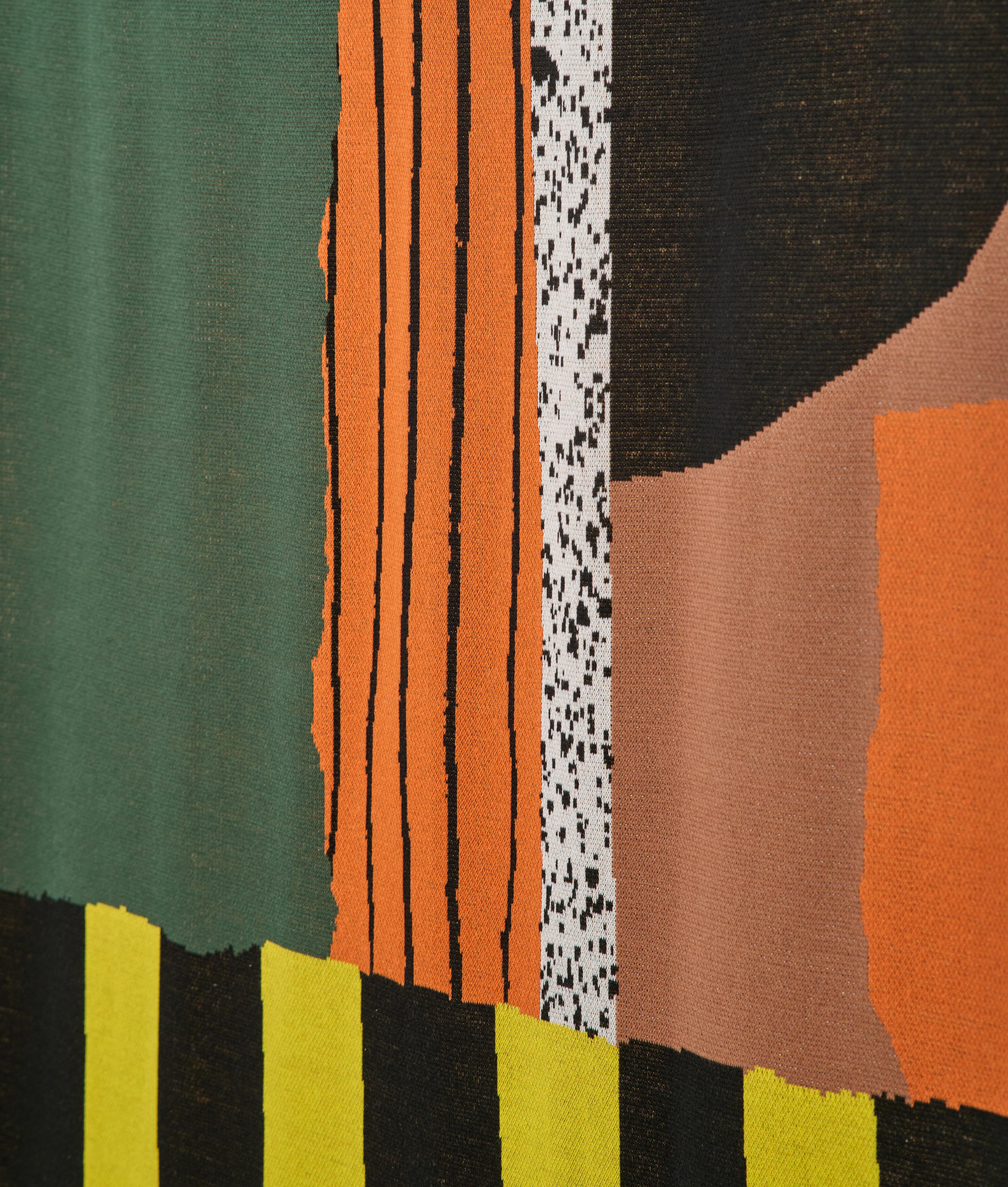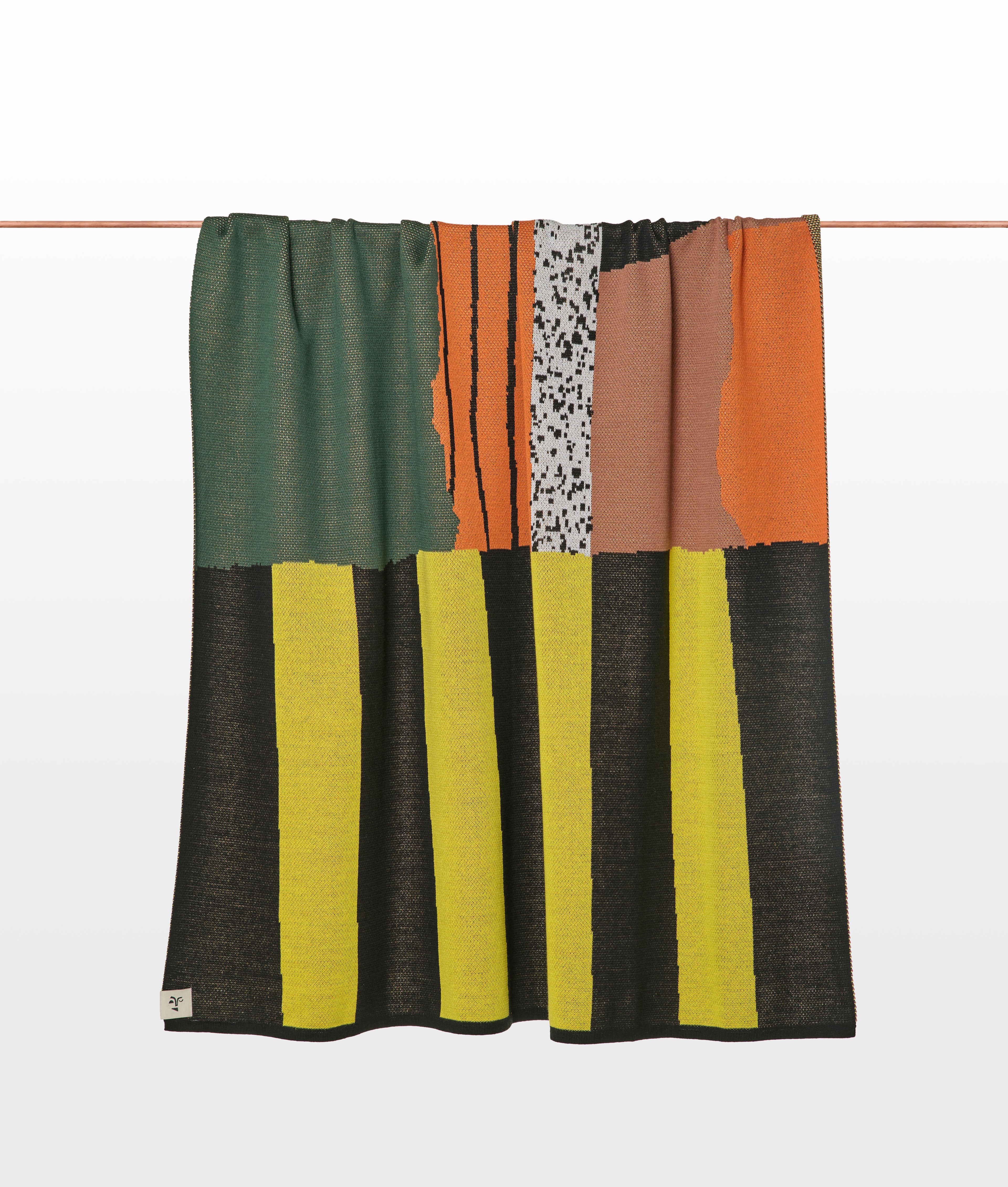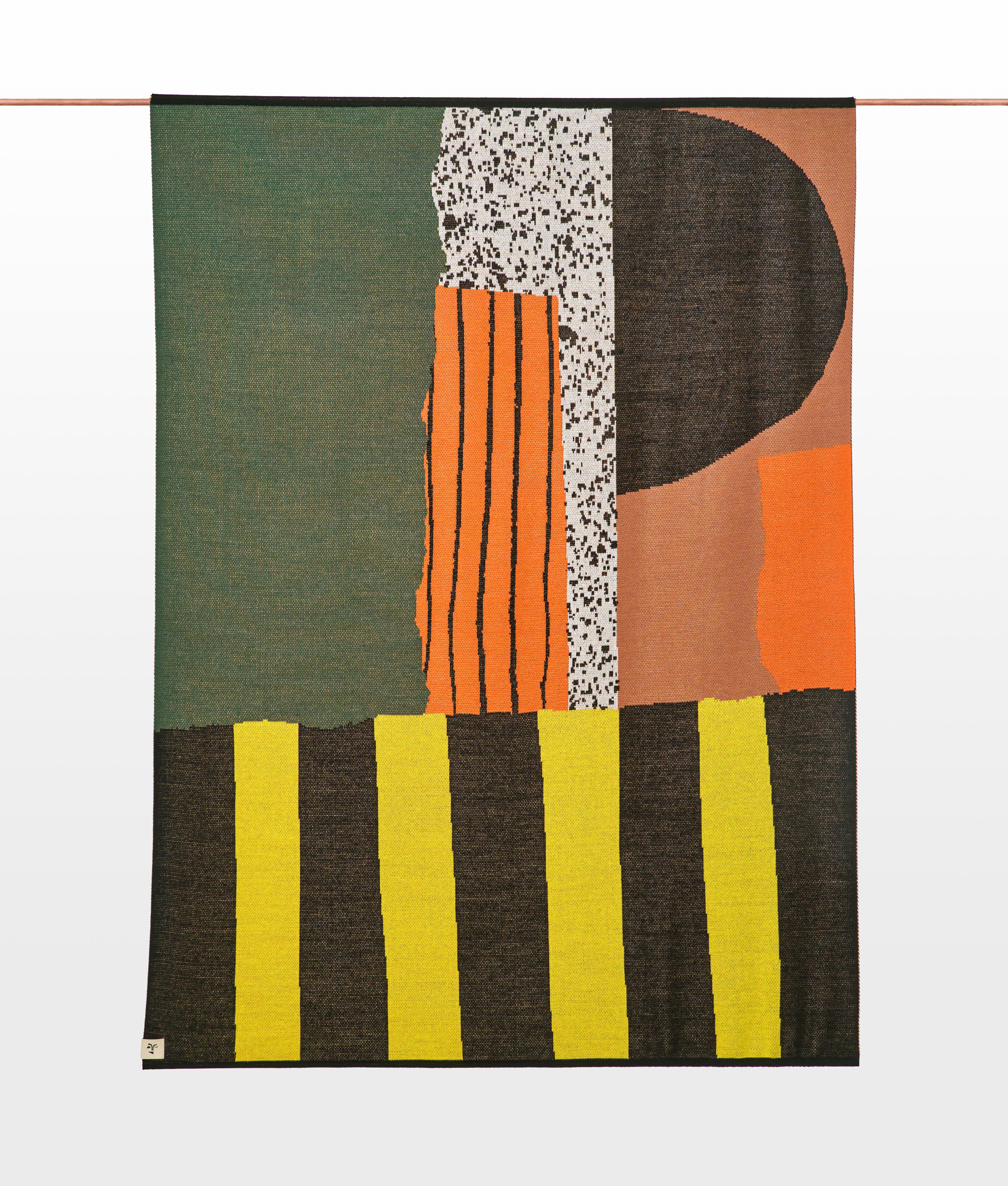 O desenho desta manta foi criado a partir de colagem feita à mão com papel e reproduzida em tricô com fio Seridó, à base de algodão.