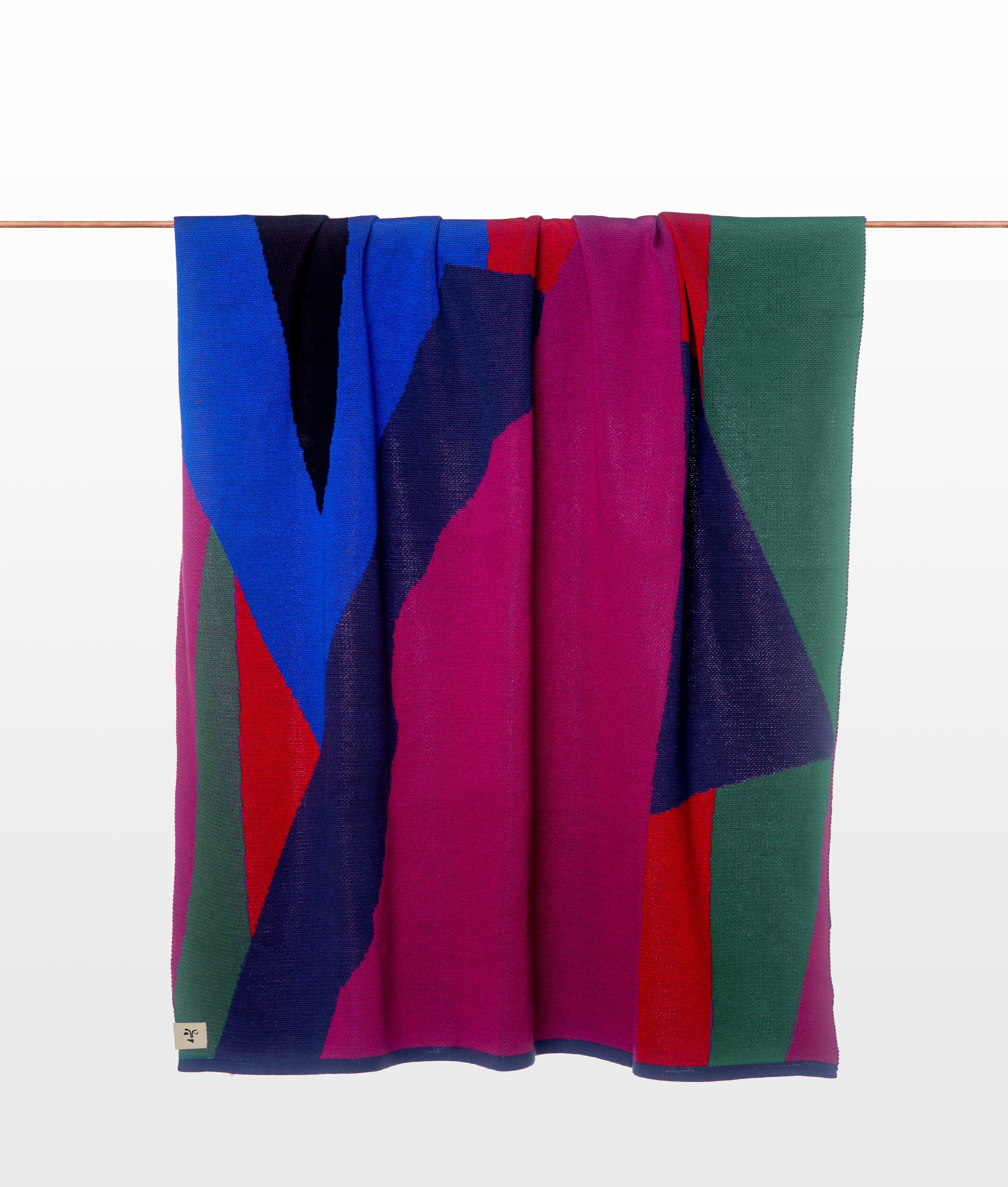 O desenho desta manta foi criado a partir de colagem feita à mão com papel e reproduzido em tricô com fio Seridó, à base de algodão.