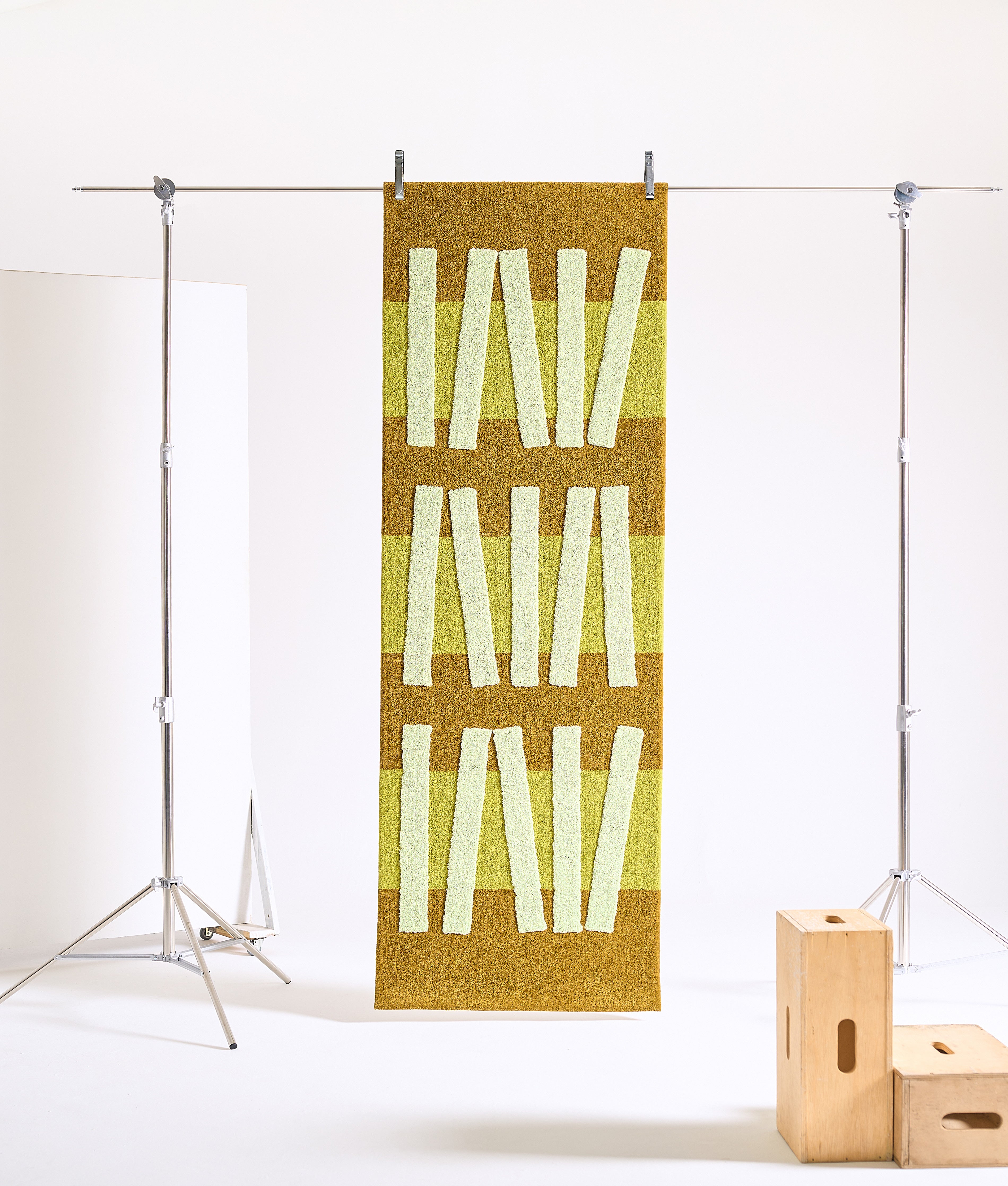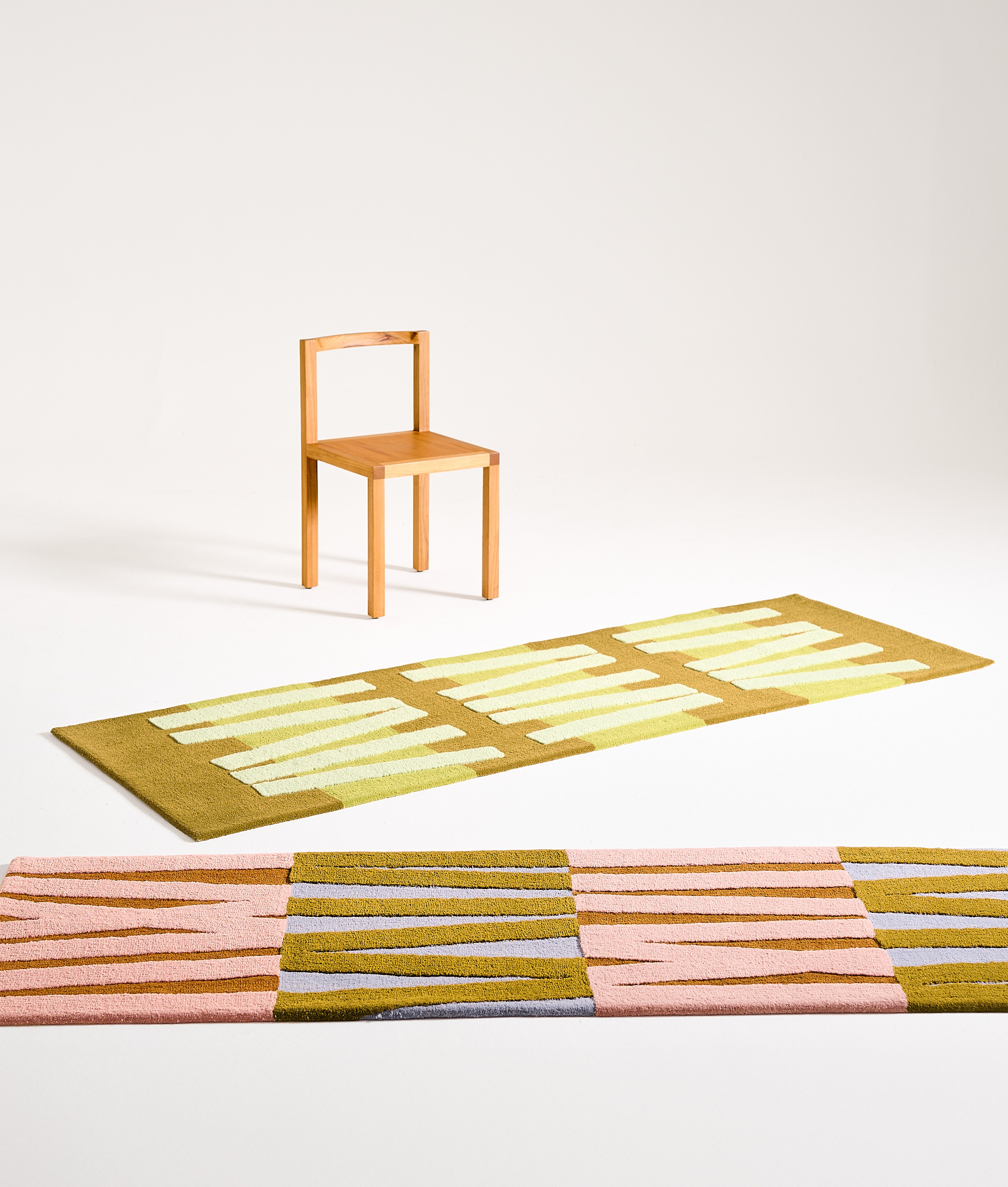 Passadeira modular com desenho original criado a partir de colagens em papel e fabricação semi-artesanal em tufting. Textura super macia, com relevos localizados.